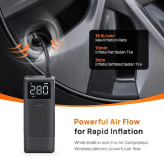 کمپرسور هوای بیسیم در حالی که اندازه کوچک دارد جریان هوای قدرتمندی را ارائه میکند. با نرخ باد چشمگیر 18.5 لیتر در دقیقه، کاملاً نیازهای مختلف روزانه را برآورده می کند. این می تواند یک لاستیک سدان صاف را در حدود 10 دقیقه پمپ کند یا یک تایر سدان نیمه خالی را تنها در 5 دقیقه پمپ کند (* یک تایر سدان معمولی سایز 195/70R14 است.)