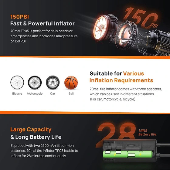 همیشه برای مواقع اضطراری آماده باشید. با سیلندرها و چرخ دنده های تمام فلزی بهینه شده، کمپرسور هوای بی سیم 70mai به اندازه کافی قوی است تا به حداکثر فشار باد 150PSI برسد و به راحتی لاستیک های سخت تر دوچرخه های کوهستان و SUV های آفرود را باد کند.
