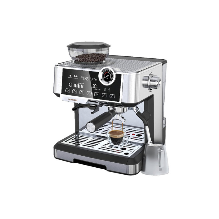با دستگاه اسپرسوساز پیشرفته LePresso، یک اسپرسوساز پیشرفته با صفحه نمایش لمسی تعاملی به رنگ نقره ای، از قهوه خود به سبک لذت ببرید. دستگاه اسپرسوساز پیشرفته LePresso دارای ولتاژ 220-240 ولت و دارای فرکانس 50-60 هرتز با توان عملیاتی 1350 وات برای کارایی کلی و سازگاری در عملکرد آن است. مجهز به پمپ فشار ULKA درجه یک 19 بار، بهترین استخراج و اسپرسوی کامل و غنی را تضمین می کند. طراحی کاربرپسند است، با یک دوشاخه برق 3 پین بریتانیا و یک رابط صفحه نمایش لمسی بصری که ساده ترین راه را برای تنظیم تنظیمات فراهم می کند. همچنین به شما این امکان را می دهد که اسپرسوی خود را همانطور که می خواهید شخصی سازی کنید. تنظیمات آسیاب، همراه با آسیاب مخروطی، از آسیاب کامل هر دانه برای حفظ عطر و طعم کامل در قهوه شما مراقبت می کند. مخزن آب 2.5 لیتری به اندازه کافی جادار است که به شما امکان می دهد دفعات پر کردن مجدد آن را کاهش دهید. سطح فشار در دیگ بخار به راحتی در یک نگاه با گیج دیگ کنترل می شود. فنجان گرم کن داخلی فنجان ها را تا دمای مطلوب گرم می کند تا اسپرسوی شما گرم و خوش طعم بماند. دستگاه اسپرسوساز پیشرفته LePresso به شما این امکان را می دهد که اسپرسویی با کیفیت باریستا را در راحتی در خانه خود ایجاد کنید. این اسپرسو ساز با ویژگی های غنی، تجربه نهایی دم کردن را به درب منزل شما می آورد و به شما امکان می دهد از یک فنجان اسپرسو عالی در راحتی چهار دیواری خود لذت ببرید.