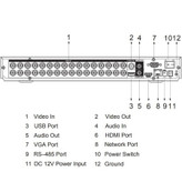 - پورتهای ورودی BNC: دستگاه دارای ۳۲ پورت ورودی BNC است که برای اتصال دوربینها به دستگاه استفاده میشوند. هر پورت دارای یک شماره است که کانال تصویر را نمایش میدهد.