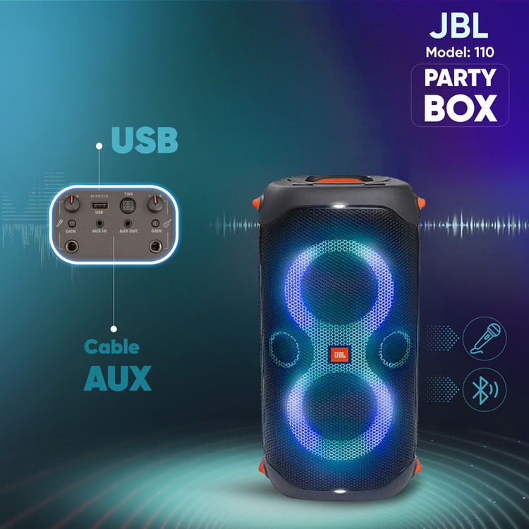 اسپیکر JBL PartyBox 110 دارای یک طراحی جمع و جور است که می توان آن را با یک دست حمل کرد. همراه با صدای با کیفیت JBL Original Pro با ظرفیت قدرت 160 وات با پاسخ فرکانس 45 هرتز تا 20 کیلوهرتز و حساسیت 6 دسی بل همراه است که مجموعه ای از فن آوری های پیشرفته مانند بلوتوث 5.1 را در خود دارد.